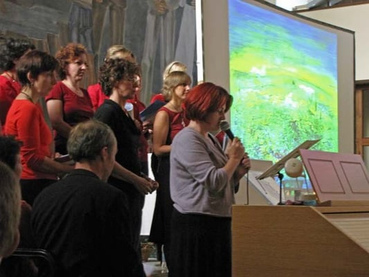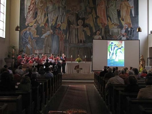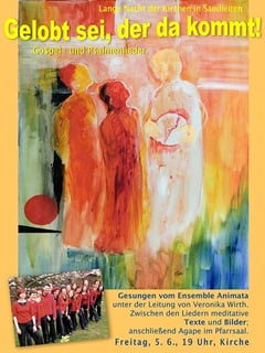 In sprichwörtlichem Sinne untermalt werden die Lieder mit Acryl-Bildern von Frau Dietlinde Petz und Helga Wiehart. Frau Petz war bis zu ihrer Pensionierung Religionslehrerin, hat schon als Kind ihre Liebe zu Pinsel und Leinwand entdeckt und stellt ihr großes Talent immer wieder in Dienst unserer Pfarrgemeinde. Auch ihre Bilder stahlen ein farbenfrohes Ja zum Leben und einen tief verwurzelten Glauben aus.