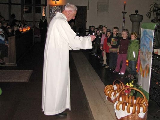 Der traditionelle Laternenumzug fand wegen Regenwetters nicht wie geplant im Kongresspark, sondern in der Kirche statt. Am Ende bekamen die Kinder die Martinskipferln, um sie mit Eltern, Geschwistern und Freunden zu teilen.