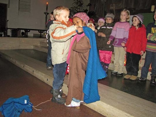 Die Kinder spielten die Geschichte vom heiligen Martin, der mit einem Bettler seinen Mantel teilt. Und danach führten uns die Kinder, passend zum Jahresthema Mit 30 Kindern um die Welt, einen Laternentanz auf japanisch vor. Mit den selbstgebastelten und japanischen Lampions tanzten sie zu einer passenden Musik einen "völkerverbindenen" Tanz.