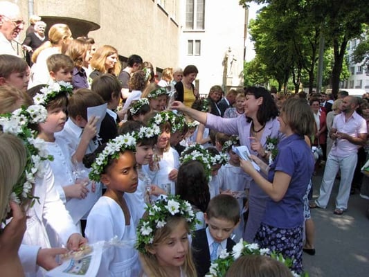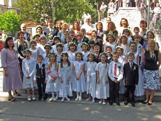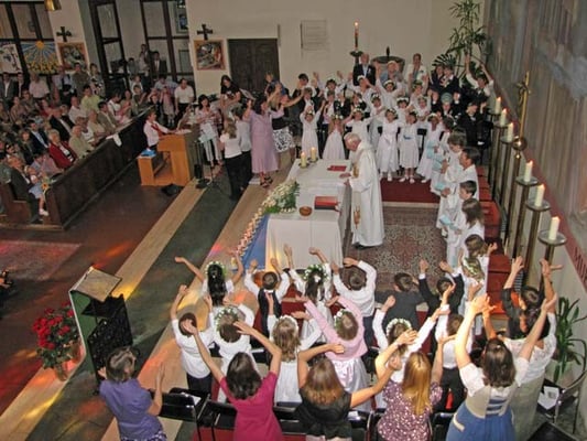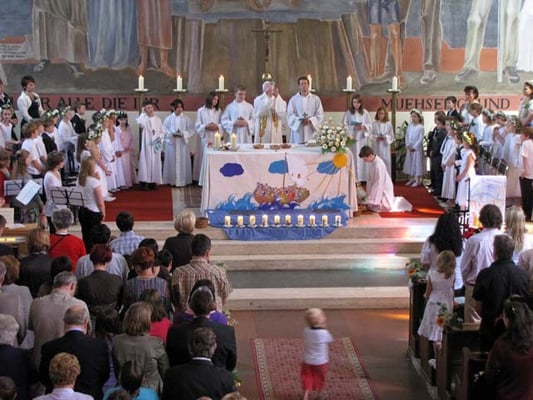 Insgesamt 33 Kinder feierten zu Christi Himmelfahrt das Fest ihrer Erstkommunion. Die 21 Mädchen und 12 Buben wurden von 8 Tischmüttern und einem Tischvater ein halbes Jahr lang auf diesen Augenblick vorbereitet.