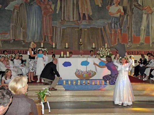 Das Altarbild zeigt am Beginn der Messe nur ein Boot mit den Fotos der 31 Kinder. Vor dem Evangelium ergänzen die Kinder das Bild am Altar: