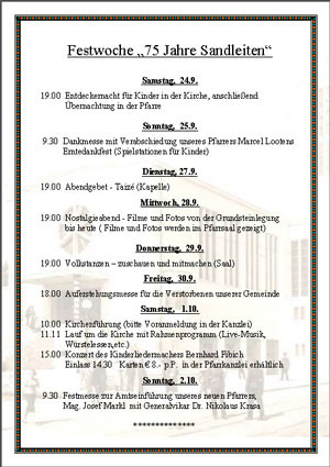 Im September 1936 wurde die Kirche von Kardinal Innitzer eingeweiht. Zum 75-jährigen Jubiläum gab es eine Festwoche in Sandleiten mit tollen Events.