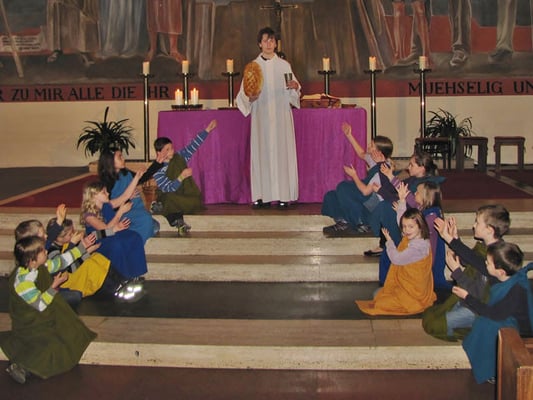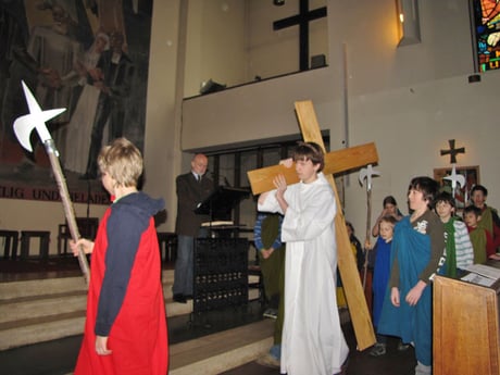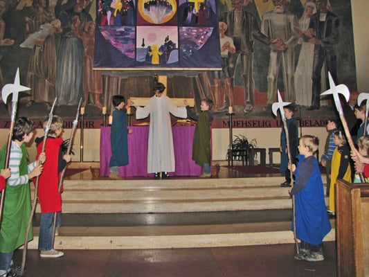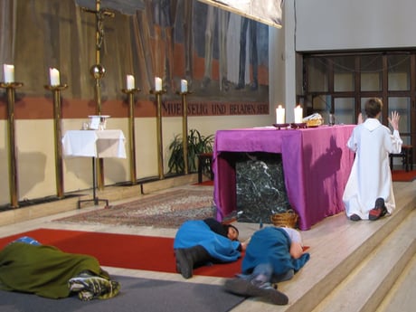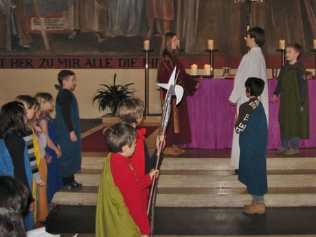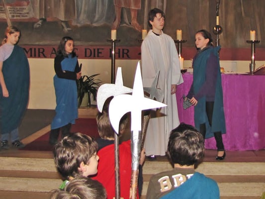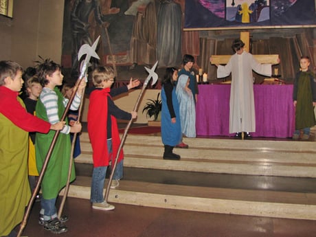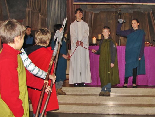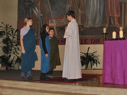 In der Messe am Palmsonntag spielten Kinder den Leidensweg Jesu vom letzten Abendmahl bis zum Tod am Kreuz.