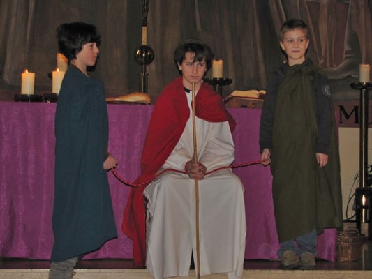 Die Requisitien sind aus einfachstem Materialien. Jesus trägt ein Ministrantengewänder, als Umhänge werden bunte Tischtücher verwendet und die Lanzen sind aus Ästen gefertigt. Danke an Helga Dietrich für das Einkleiden unserer Passionskinder!