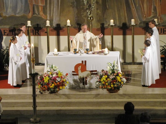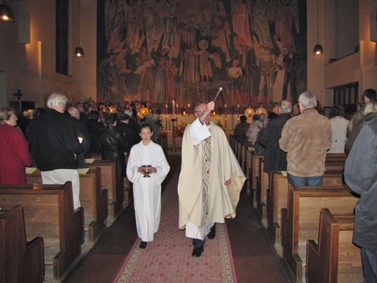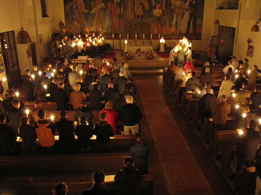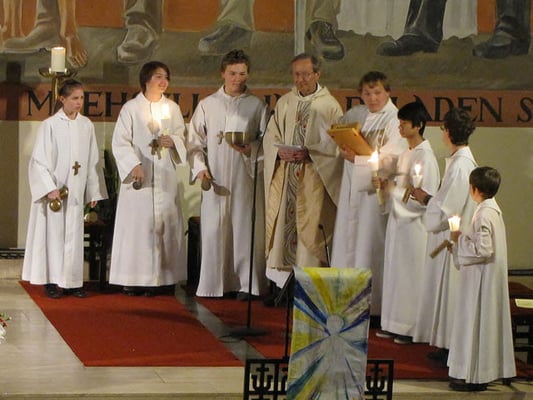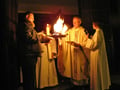 Dann wird die neue Osterkerze mit dem Osterlicht entzündet und mit dem Ruf "Lumen Christi" feierlich in die dunkle Kirche getragen.