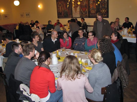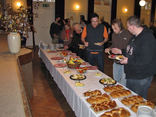Nach der Auferstehungsfeier, als es draußen schon hell war, gab es im Pfarrsaal ein gemeinsames Osterfrühstück. Am Frühstücksbuffet gab es Schinken, Käse, Ostereier und Osterstriezel.