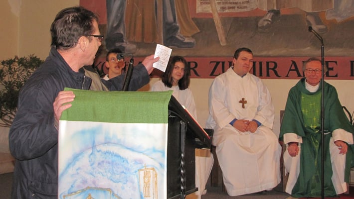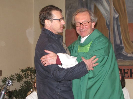 Auch wenn Pfarrer Josef keine Geschenke wollte, gab es doch eine kleine Überraschung. Im Pfarrsaal überreichte ihm Martha Mikulka stellvertretend für den Pfarrgemeinderat eine kleine Geld Kollekte, die ihm einen Herzenswunsch erfüllen soll. Nein, nicht die Besteigung des Mount Everest oder Kilimanscharo, sondern ein rotes Priestergewand. "In der Pfarre Nordrandsiedlung gab es ein schönes rotes Priestergewand für besondere Anlässe. So eine fröhlich bunte Robe gibt es in Sandleiten leider nicht und ich habe mir schon immer eines auch für meine neue Heimat gewünscht. Danke!!" freute sich unser Pfarrer.