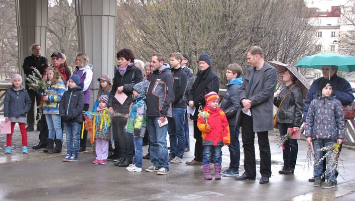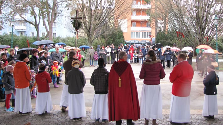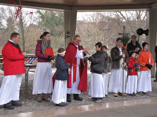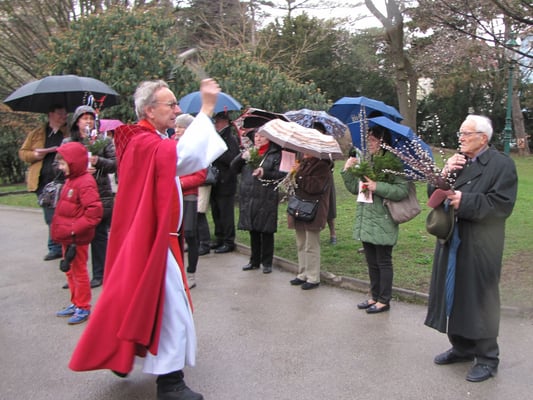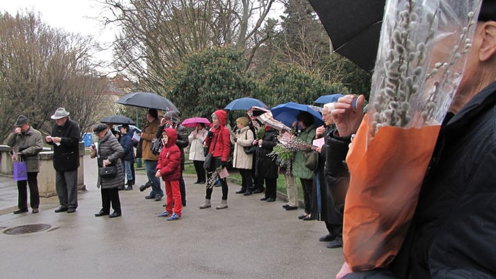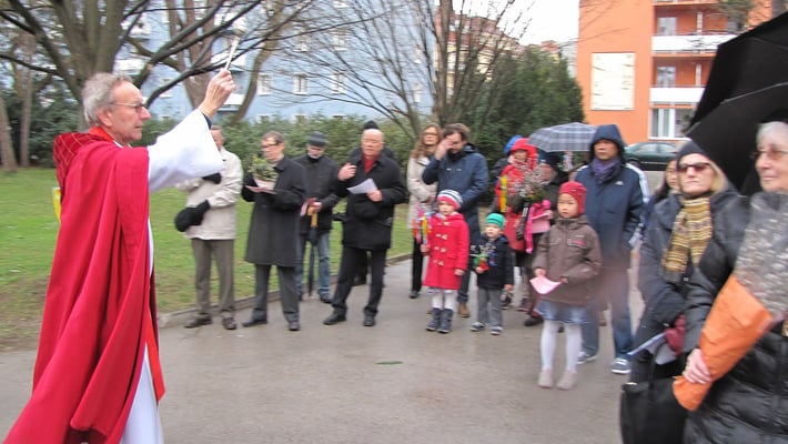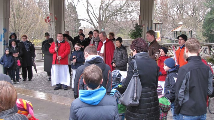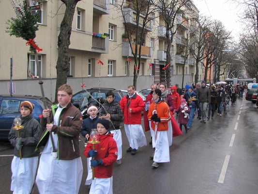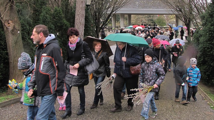 Um 9:00 war Treffpunkt bei der Milchtrinkhalle im Kongresspark. Dort wurden die mitgebrachten Palmkätzchen geweiht, bevor die Prozession Richtung Kirche aufbrach. Durch den leichten Regen kamen zu Beginn nur wenige Leute zur Milchtrinkhalle. Aber am Ende zählte die Prozessionsschlange mehr als 100 Teilnehmer.