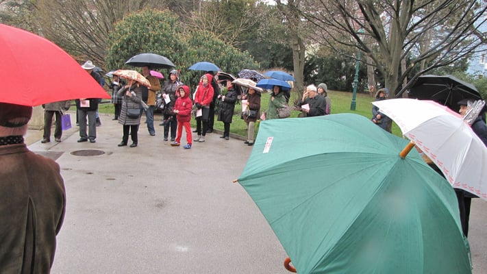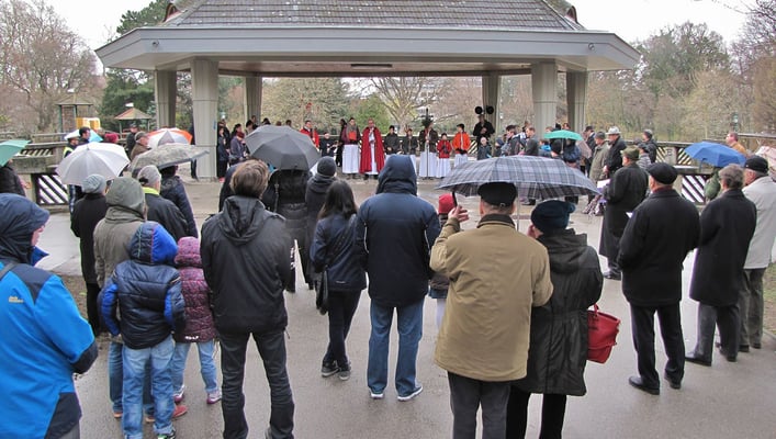Um 9:00 beim Treffpunkt im Kongresspark regnete es leicht. Trotzdem fand die Prozession statt. "Das leichte Nieseln wird uns nicht abhalten. Und Regenschirme gibt es ja schon seit 200 oder 300