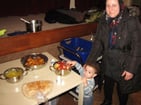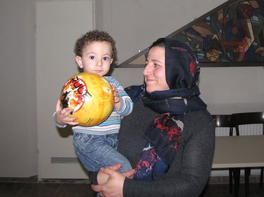Die von der EineWelt Gruppe betreute syrische Flüchtlingsfamilie war am Suppensonntag auch zu Gast und brachte kleine Kostproben aus der syrischen Küche mit. Das Foto zeigt Zakia mit ihrem kleinsten Sohn und den Kostproben.