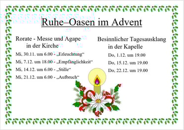 Ruhe-Oasen im Advent - unter diesem Motto sind alle an den vier Mittwochen in der Adventzeit zur Einstimmung auf Weihnachten herzlich eingeladen. Die zweite Rorate ist um 18:00 abends.