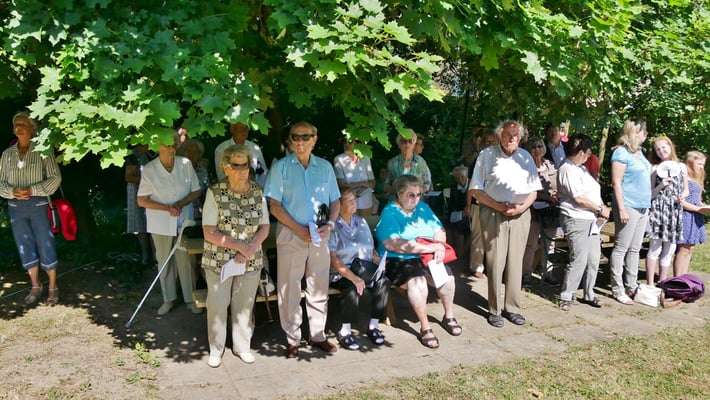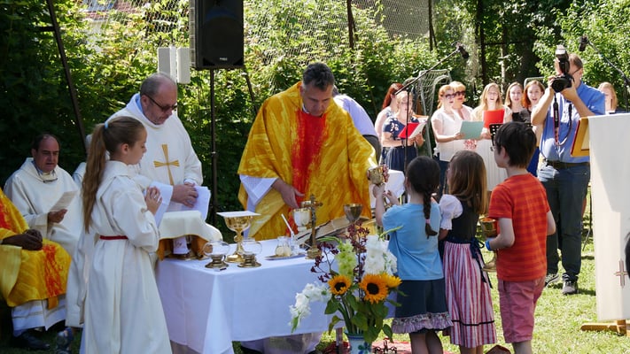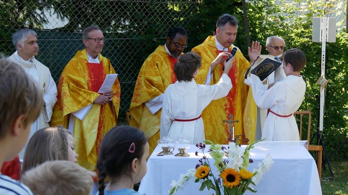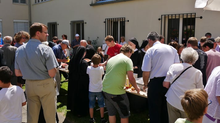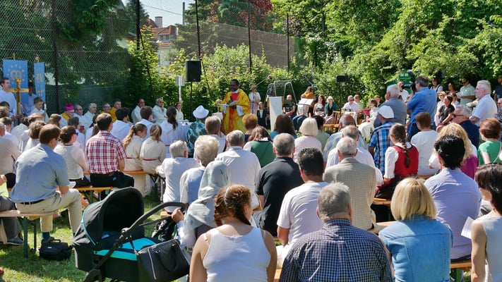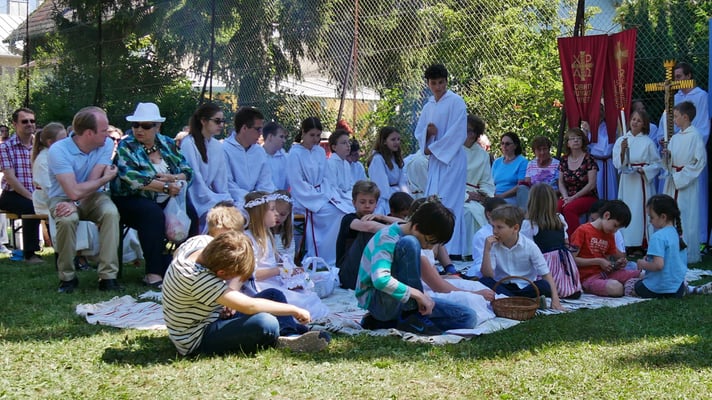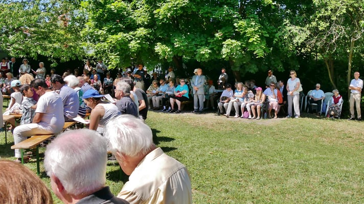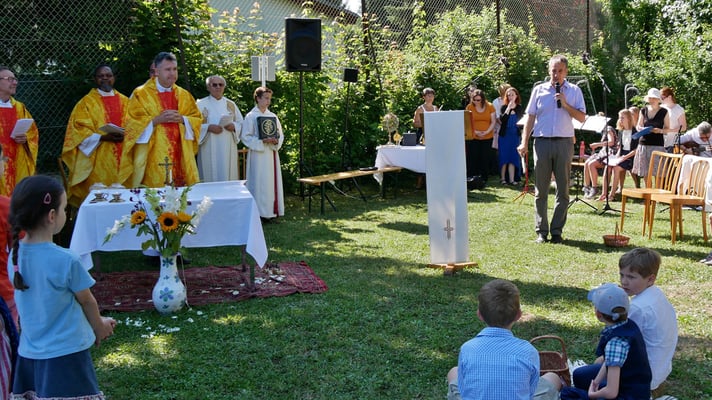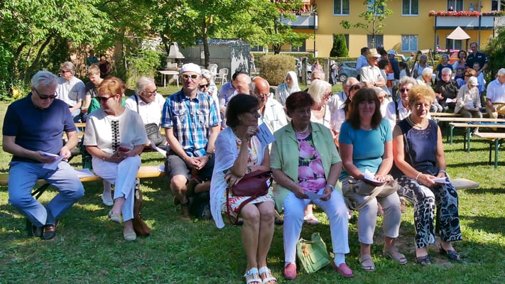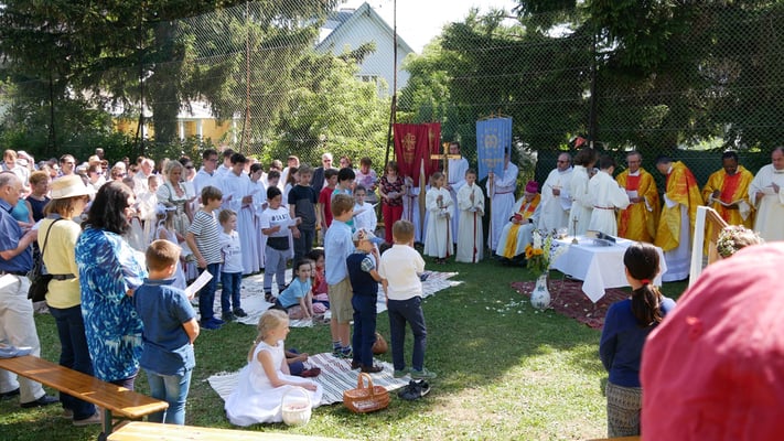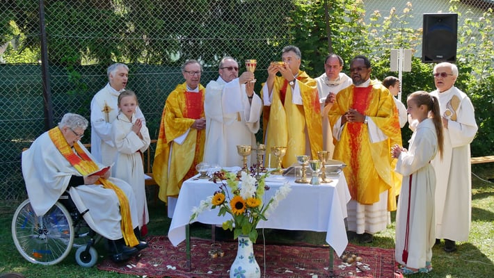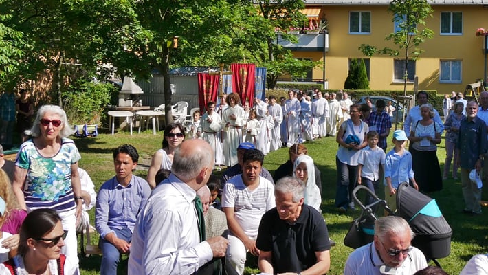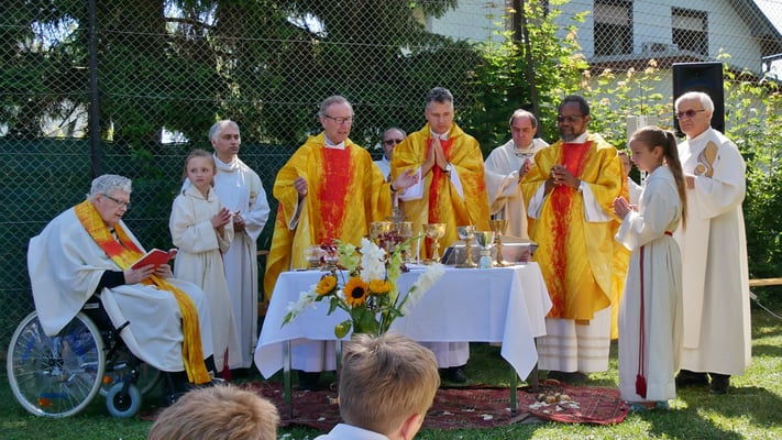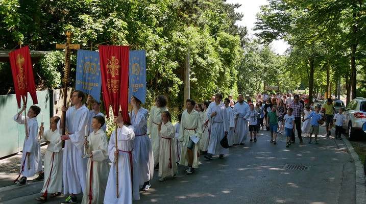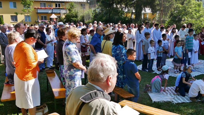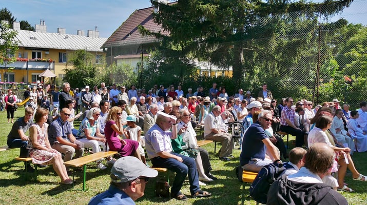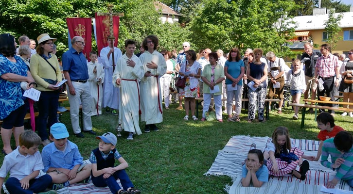 So wie im Vorjahr war Fronleichnam ein gemeinsames Fest von Alt-Ottakring, Sandleiten und Starchant. Bei strahlend blauem Himmel feierten rund 500 Besucher aus den 3 Pfarren auf der Pfarrwiese Starchant eine gemeinsame Messe. Danach zog die Prozession zum Kloster Liebhartstal, wo die Schwestern eine Agape vorbereitet hatten.