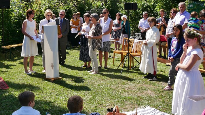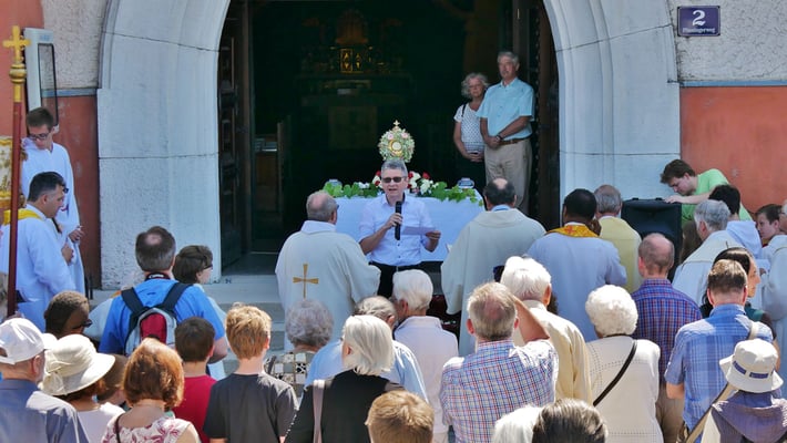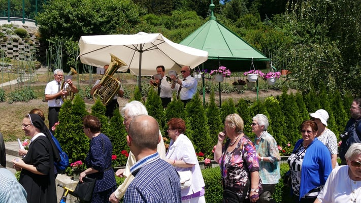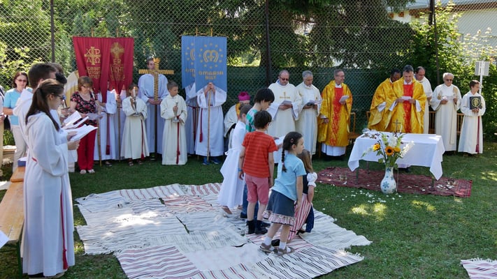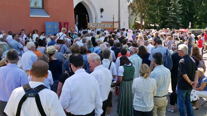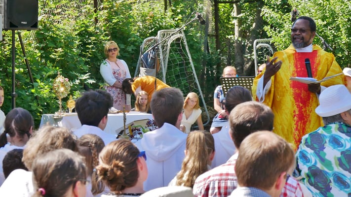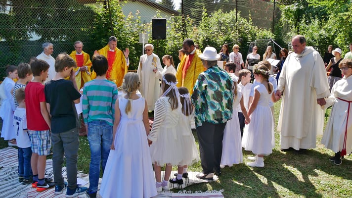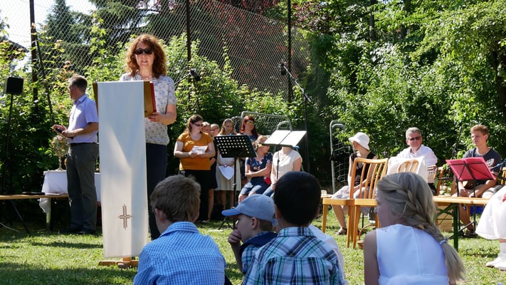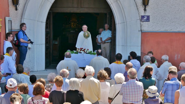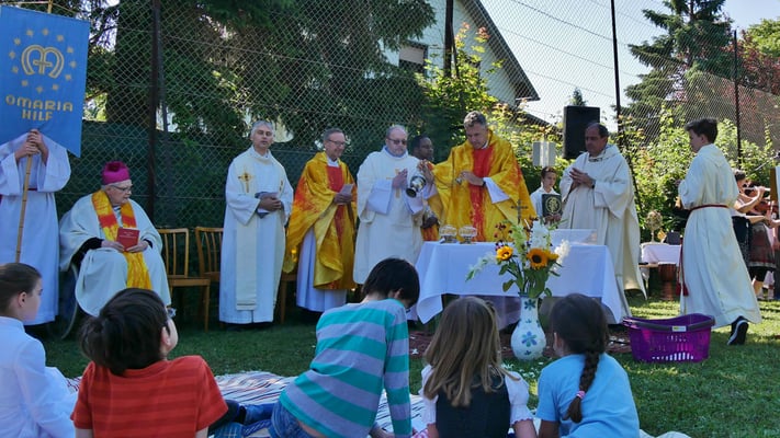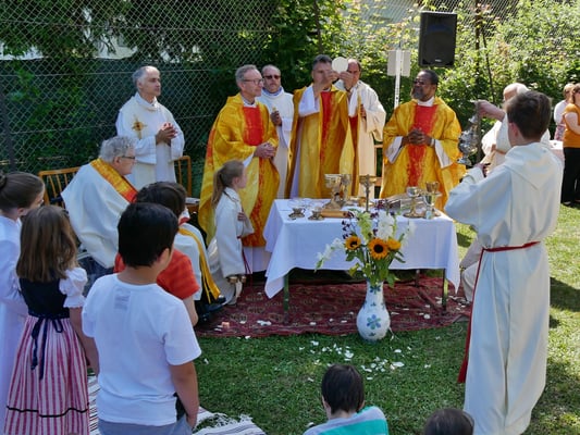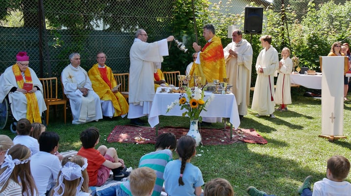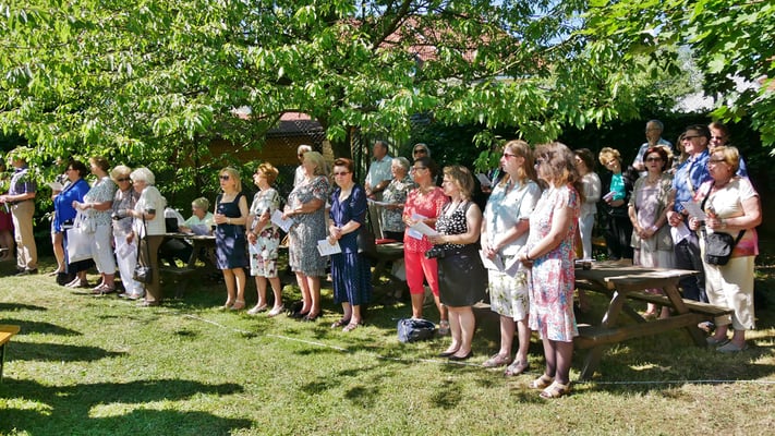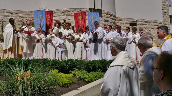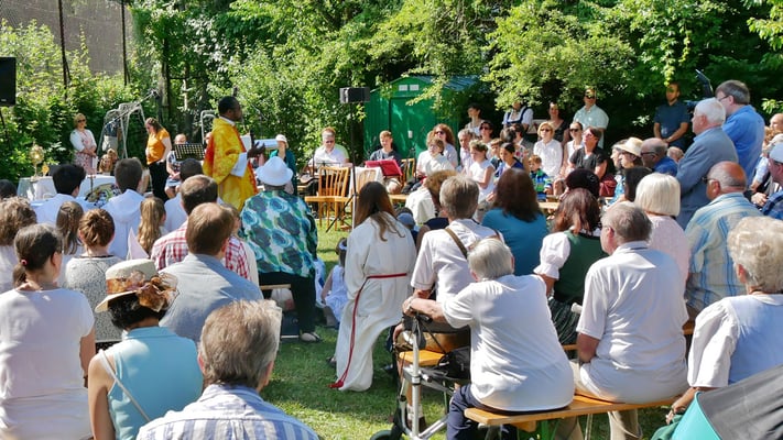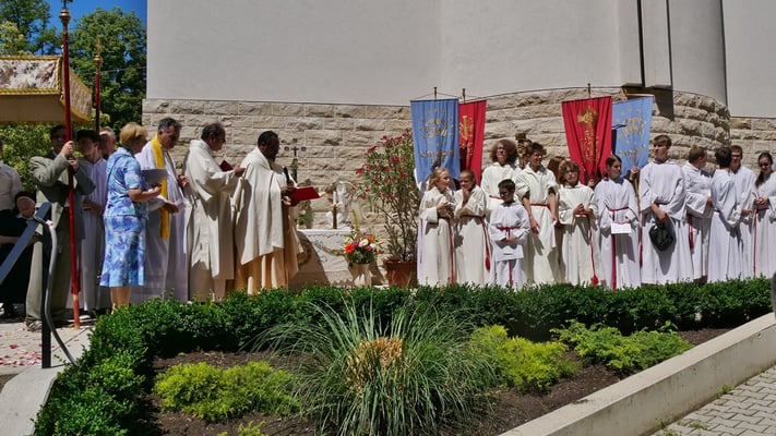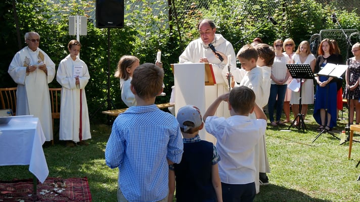 So wie im Vorjahr war Fronleichnam ein gemeinsames Fest von Alt-Ottakring, Sandleiten und Starchant. Bei strahlend blauem Himmel feierten rund 500 Besucher aus den 3 Pfarren auf der Pfarrwiese Starchant eine gemeinsame Messe. Danach zog die Prozession zum Kloster Liebhartstal, wo die Schwestern eine Agape vorbereitet hatten.