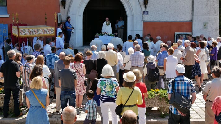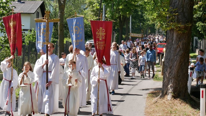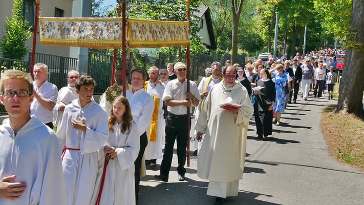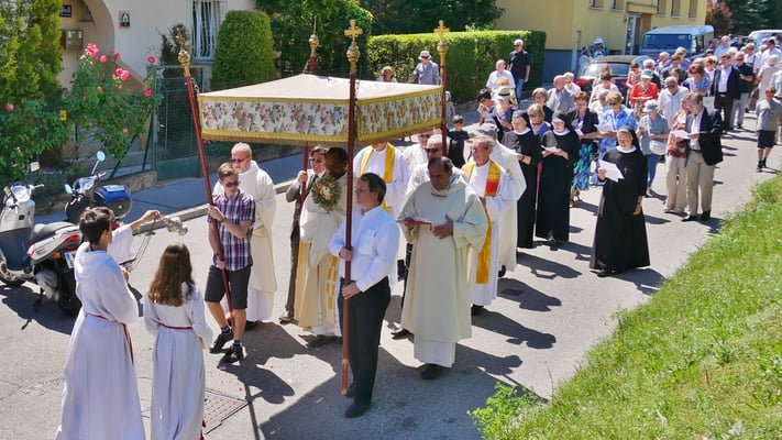 Nach der Messe ging die Fronleichnams-Prozession von der Pfarrwiese Starchant um den Häuserblock zur Kirche, wo vor dem Kirchentor ein Zwischenstopp mit kurzer Andacht stattfand. Von der Kirche ging es dann weiter über den Pönningerweg - Woborilweg - Gallitzinstraße - Wanriglgasse und die Liebhartstalstraße zum Kloster Liebhartstal. In der Mitte des Festzuges wurde die Monstranz mit dem Allerheiligsten getragen.
