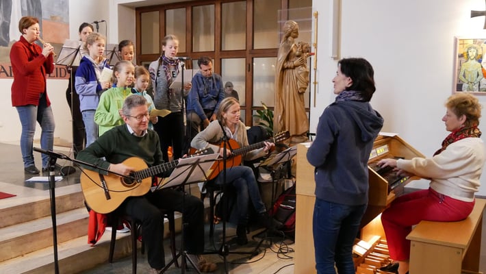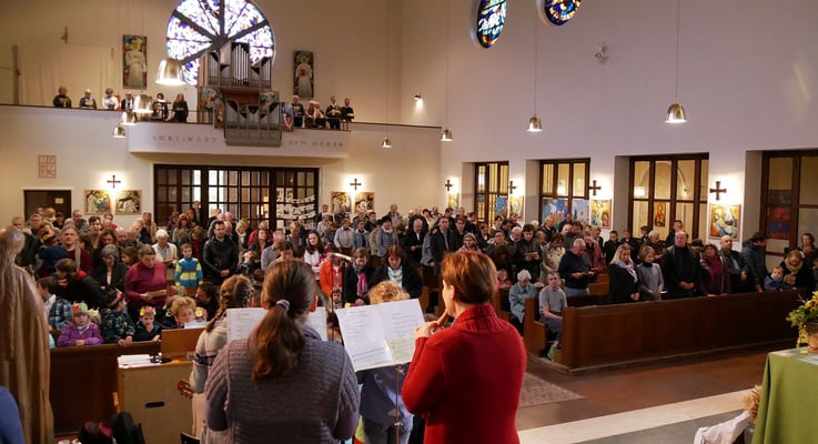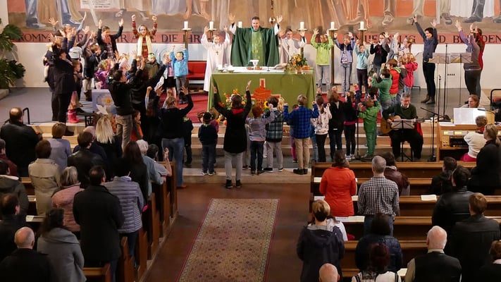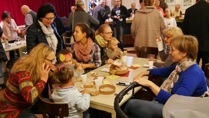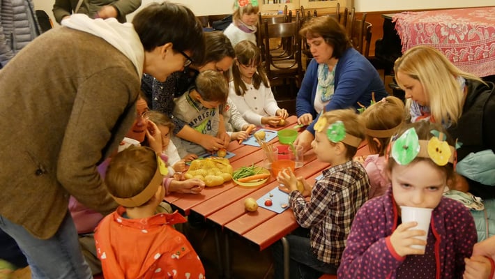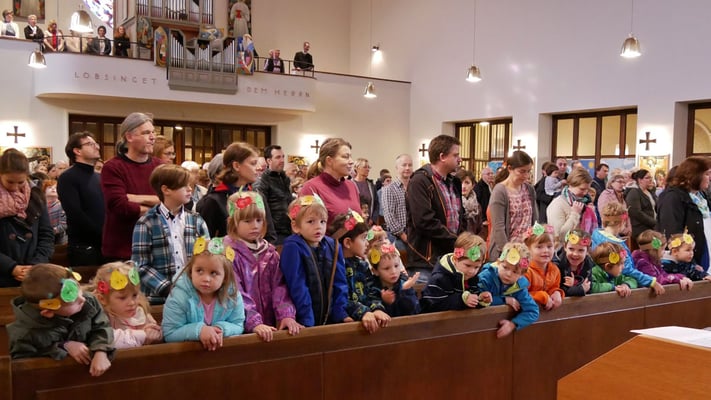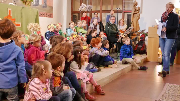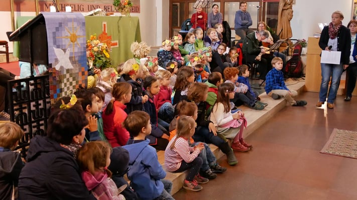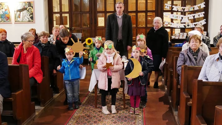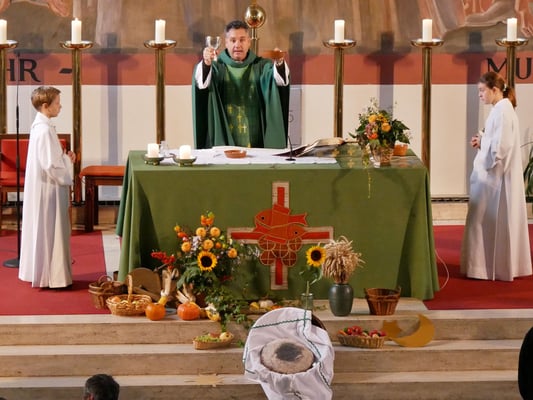 In einer Familienmesse am zweiten Sonntag im Oktober danken wir dem Herrn für die Gaben der Ernte. Leider war das Wetter so unsicher, dass die Agape nach der Messe und die Spielstationen für die Kinder im Pfarrsaal stattfinden mussten.