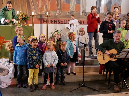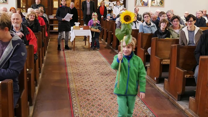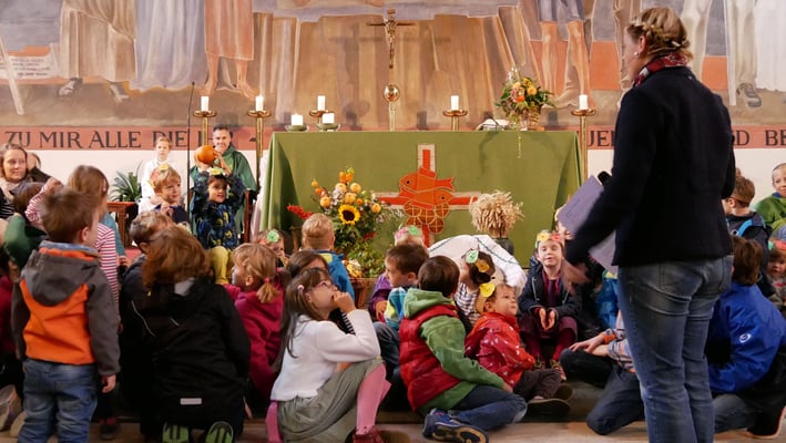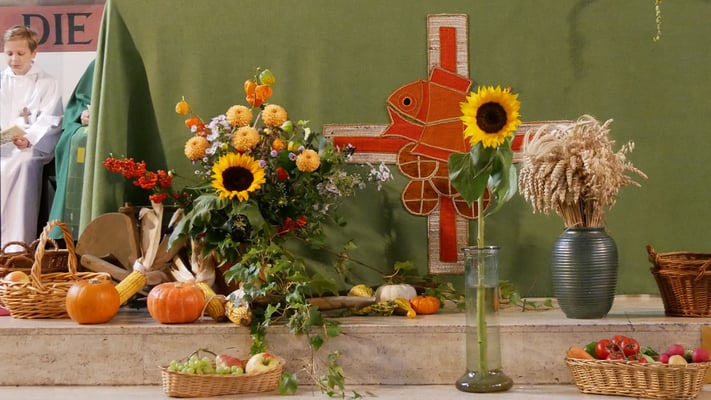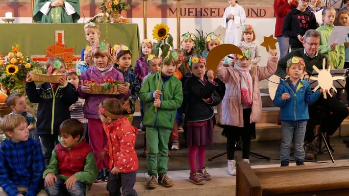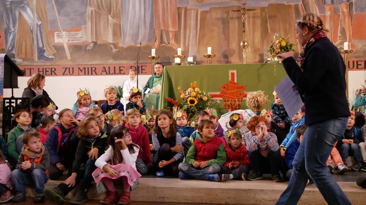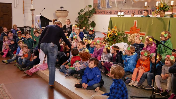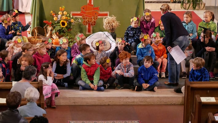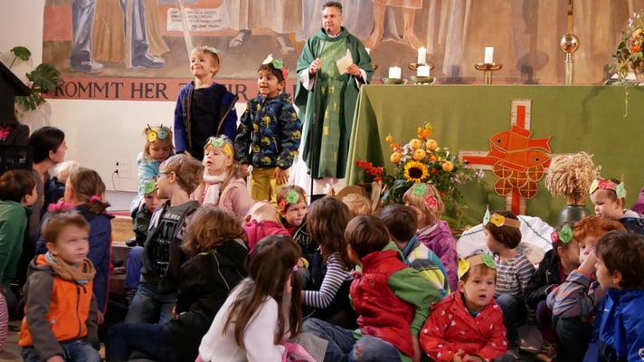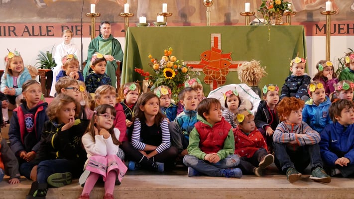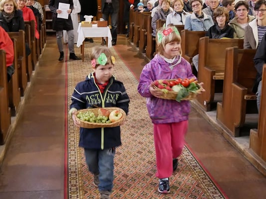 Einer alten Tradition folgend gilt an diesem Sonntag unser Dank dem Herrn für die Gaben der Ernte. In einer Kindermesse kommen die Kinder vom Kindergarten mit selbstgebastelten Erntedank-Kronen.