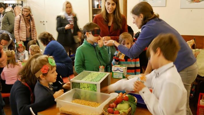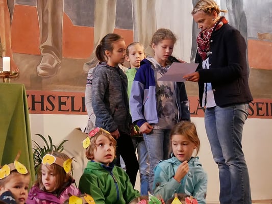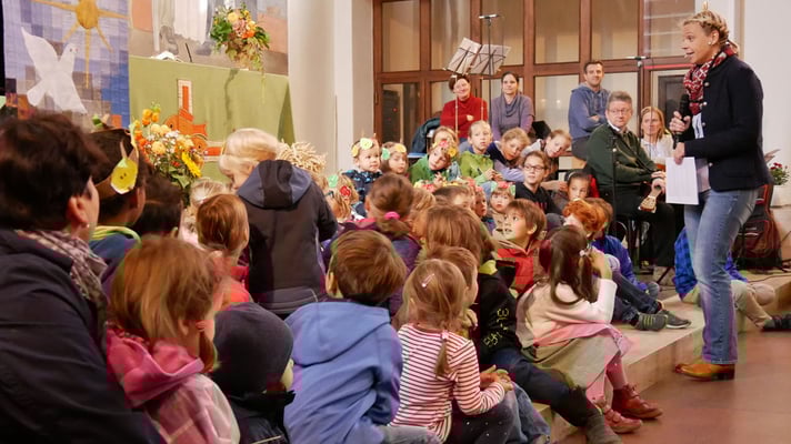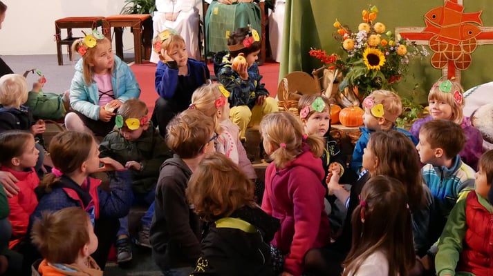Martha Mikulka erzählt die Geschichte von den Apfelkernen, die so klein und unscheinbar in den Boden fallen und als Baum wieder Äpfel wachsen lassen. Dafür und für Sonne, Wind, Regen und die Erde danken wir dem lieben Gott, damit alles gedeihen kann.