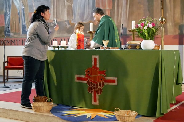 Dieses Jahresthema begleitet die Kinder in ihrer Vorbereitung seit November 2018. Dazu haben die Erstkommunion Kinder Sonnenstrahlen aus Papier, mit ihrem Namen drauf, mitgebracht und vor dem Altar zu einer hell leuchtenden Sonne zusammengelegt.
