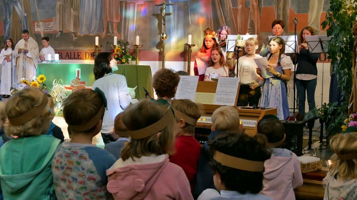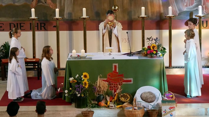 Einer alten Tradition folgend gilt an diesem Sonntag unser Dank dem Herrn für die Gaben der Ernte. Zur Familienmesse kamen die Kinder vom Kindergarten mit selbstgebastelten Erntedank-Kronen.