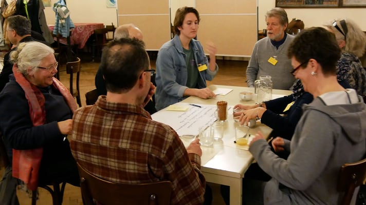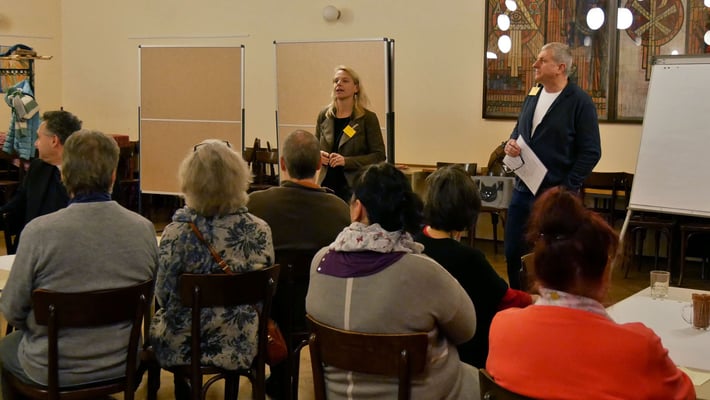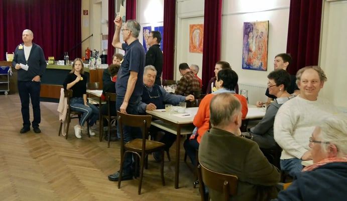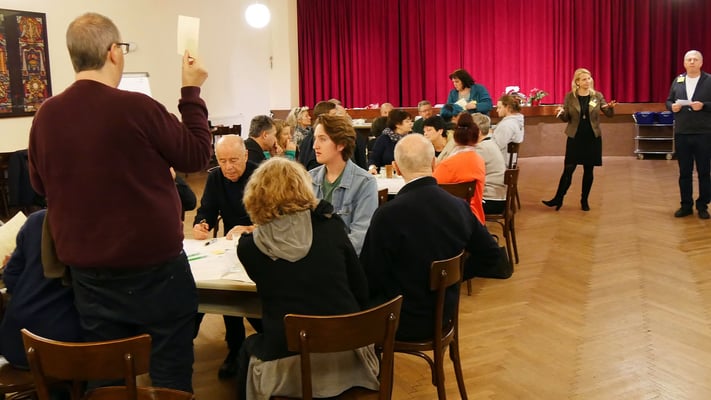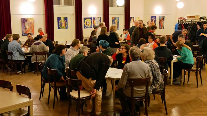 Eingeladen waren 1-2 MitarbeiterInnen aus jeder Gruppe, Runde oder Arbeitsbereich, die in der Pfarre tätig sind. Es kamen 48 Pfarrmitglieder, um sich drei Fragen zu stellen (siehe unten).