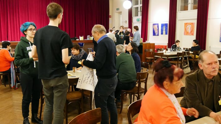 Die Teilnehmer wurden in sechs Gruppen aufgeteilt. Jede Gruppe hatte 25 Minuten Zeit Antworten auf die drei Fragen zu finden und auf einer großen Flipchart Seite festzuhalten. Die Gruppen wurden zwei Mal gewechselt und die Antworten auf der Flipchart Seite in der neuen Gruppe ergänzt.