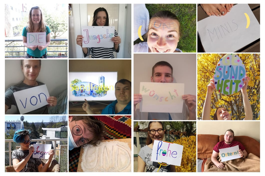 Mit ei­ner Fo­to-Col­la­ge möch­ten Jung­schar und Mi­nis­tran­ten in die­sen schwe­ren Zei­ten von zu Hau­se aus al­len ein fro­hes, ge­seg­ne­tes Os­ter­fest wün­schen. Ge­mein­sam schaf­fen wir das!