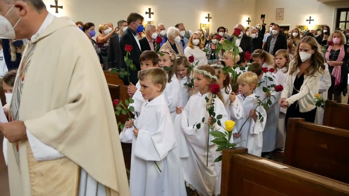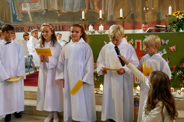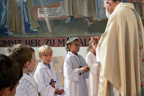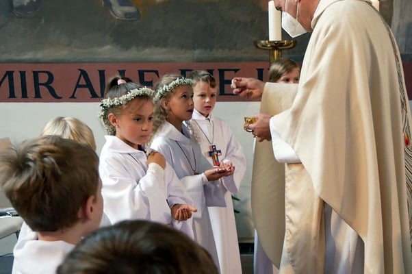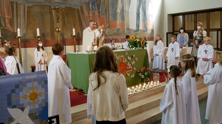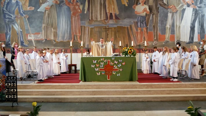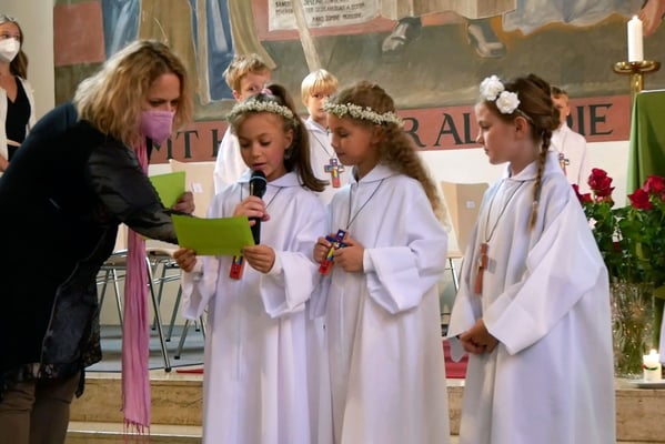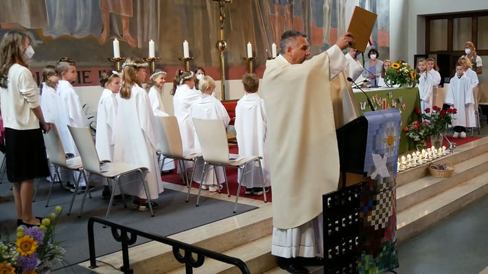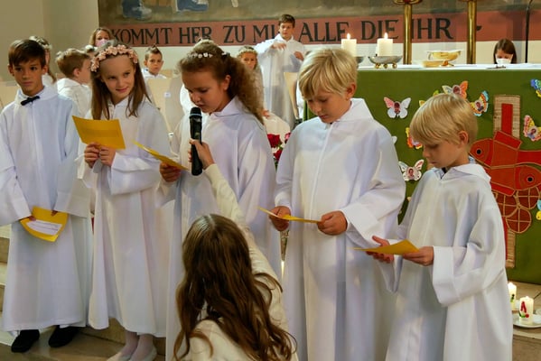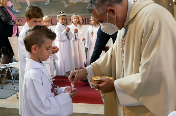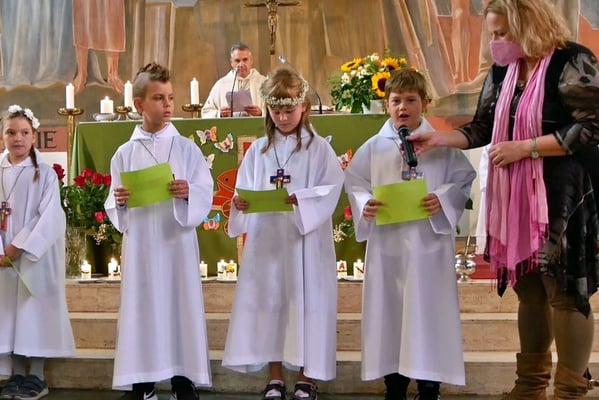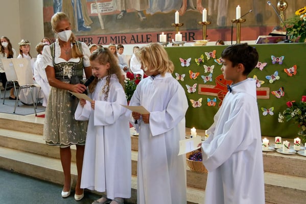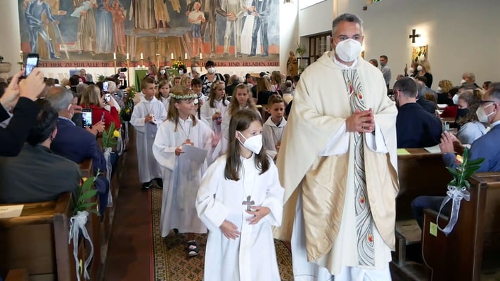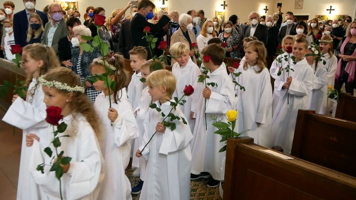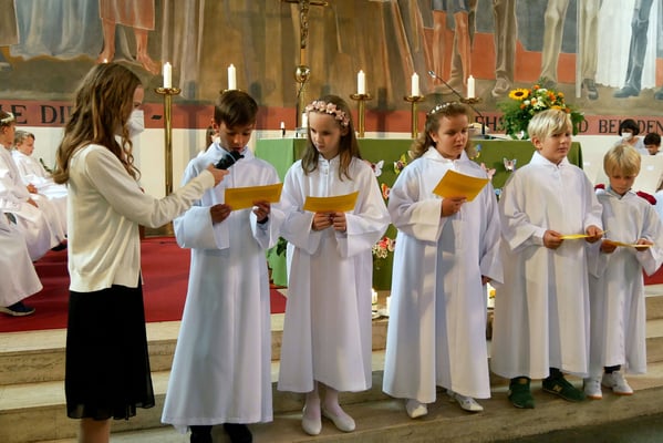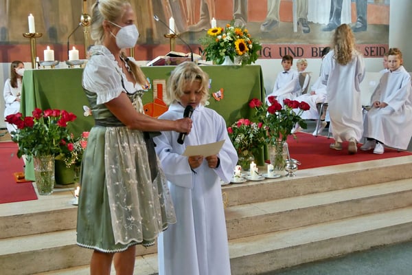 Die Erstkommunion fand wegen der Corona Pandemie erst im September an einem Samstag statt. 19 Kinder empfingen zum ersten Mal das heilige Brot und mit ca. 280 Besuchern war die Kirche voll. Der 3G Nachweis und das Tragen von FFP2 Masken wurden ohne Probleme akzeptiert.