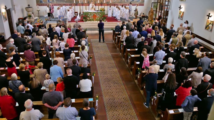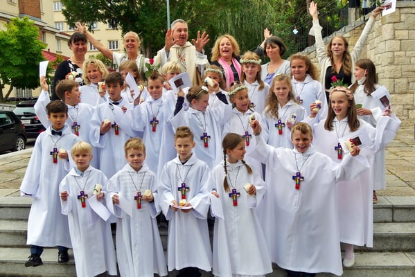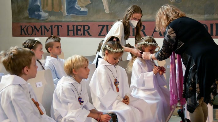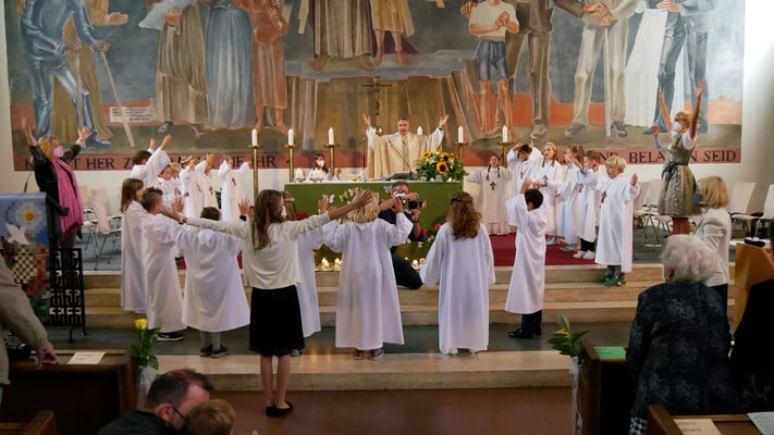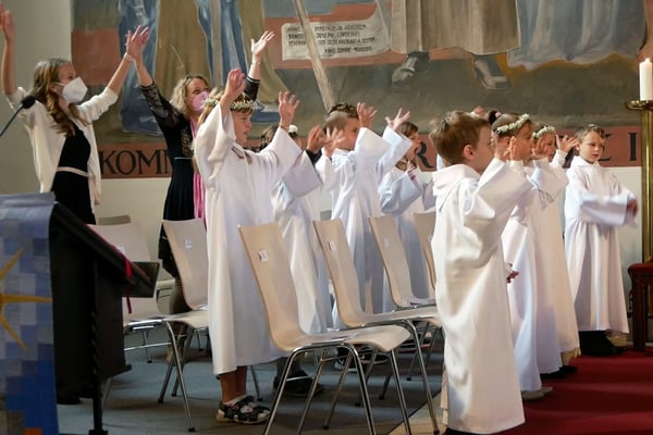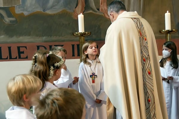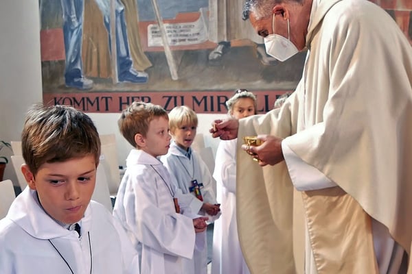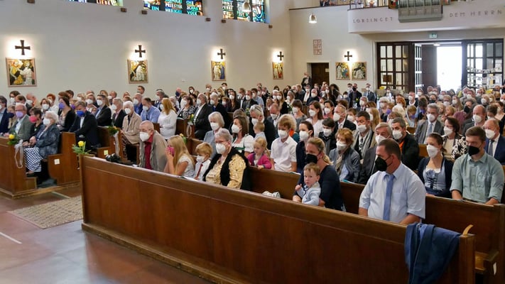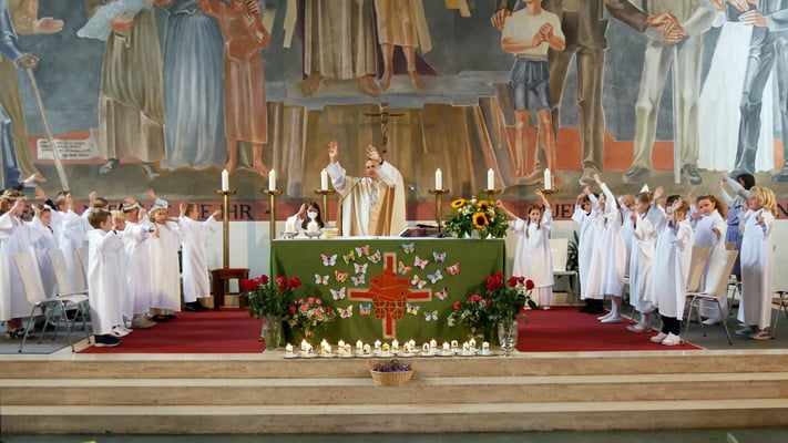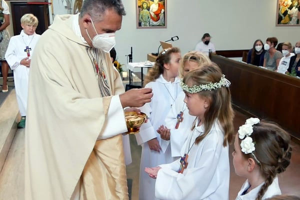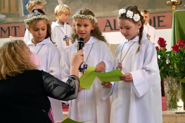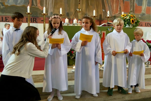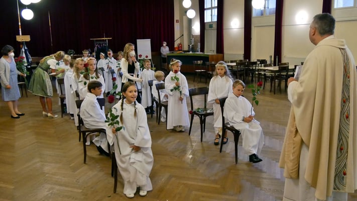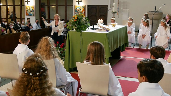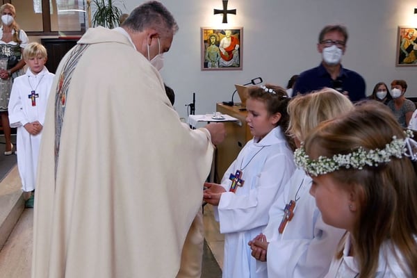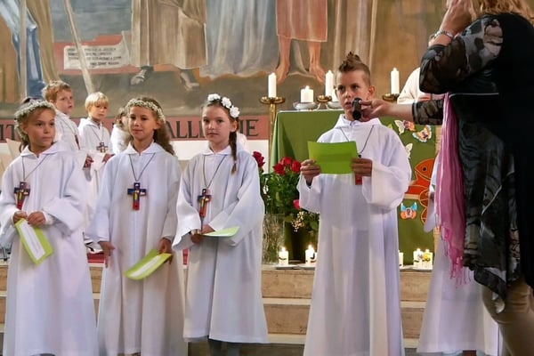 Die Erstkommunion fand wegen der Corona Pandemie erst im September an einem Samstag statt. 19 Kinder empfingen zum ersten Mal das heilige Brot und mit ca. 280 Besuchern war die Kirche voll. Der 3G Nachweis und das Tragen von FFP2 Masken wurden ohne Probleme akzeptiert.