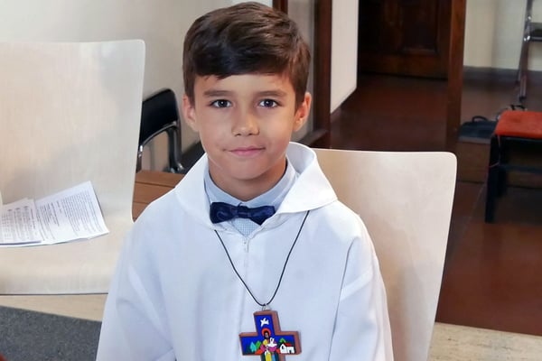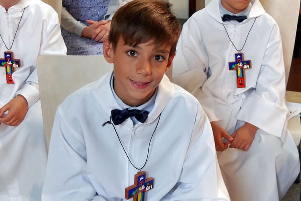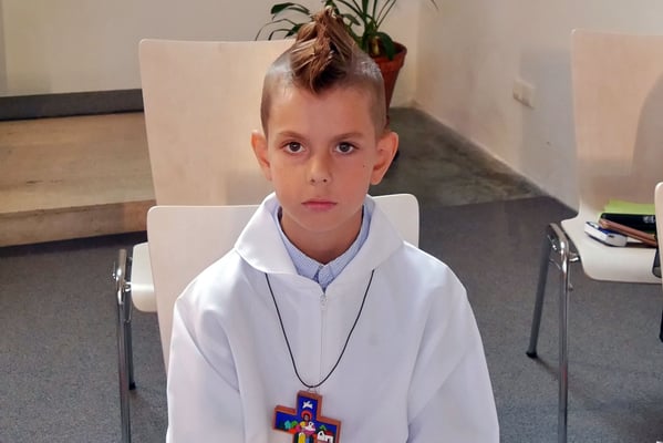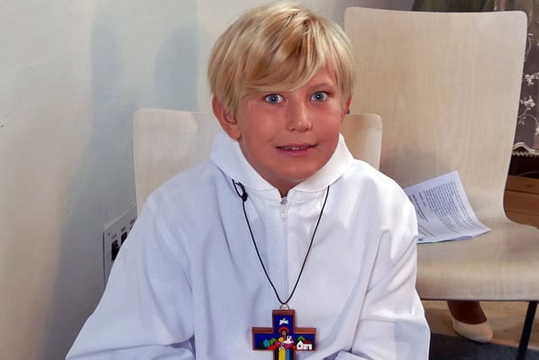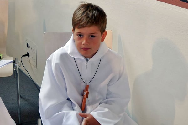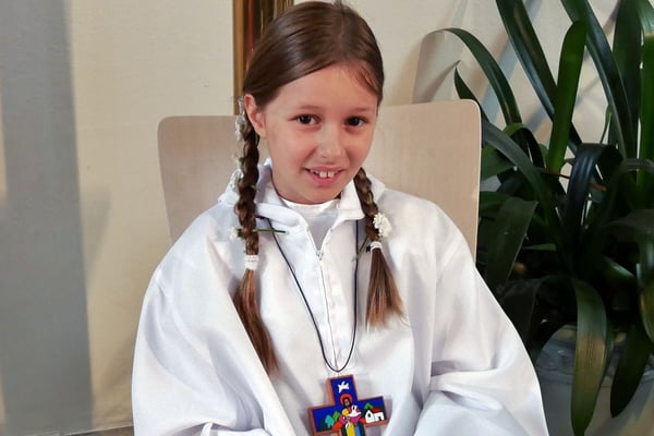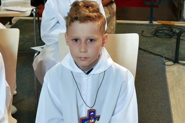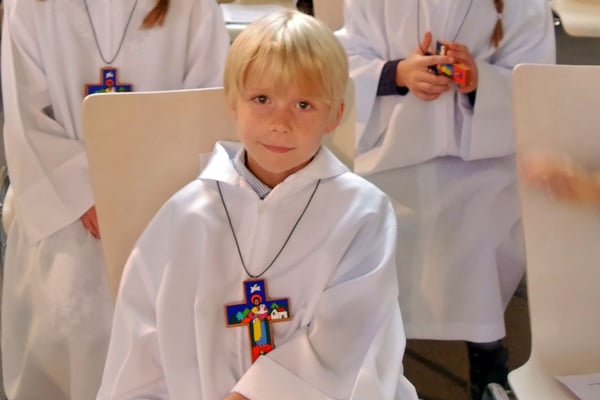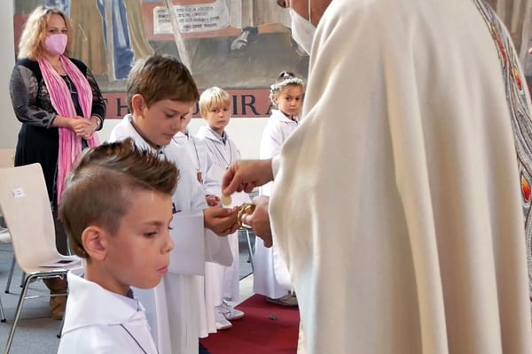 Die Pfarre stellte allen Erstkommunion Kindern einen festlichen weißen Umhang für die Erstkommunionfeier zur Verfügung, frisch gewaschen und desinfesziert. Die Kinder konnten in normalem Gewand kommen und bekamen vor der Messe den Umhang übergestreift.