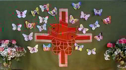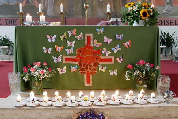 Auf dem Altartuch sind Fotos der Kinder auf Schmetterlingen abgebildet.