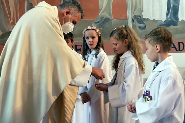 Die Vorbereitung begann am Sonntag 18.April 2021 mit einer gemeinsamen Familienmesse in der Kirche. Danach trafen sich die Kinder einmal in der Woche im Saal, in der Kirche oder bei gutem Wetter im Garten.