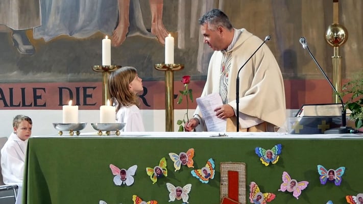 "So wie aus einer Raupe, die gar nicht so besonders ausschaut, ein wunderbarer farbenprächtiger Schmetteling wird, so möchte Jesus auch uns verwandeln, damit alles durch uns in der Welt besser, schöner, gerechter und hoffnungsvoller wird." meinte der Pfarrer in seiner Predigt.