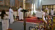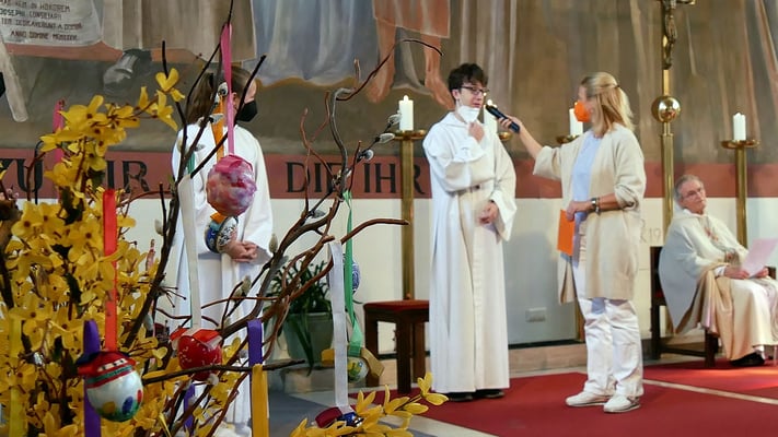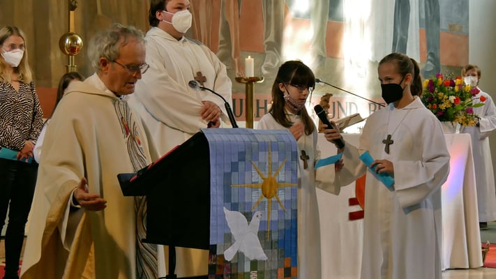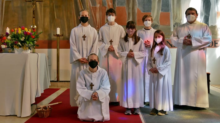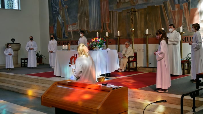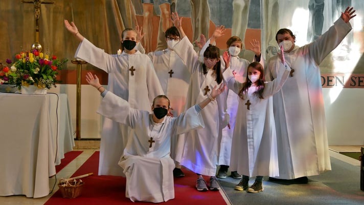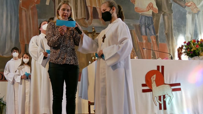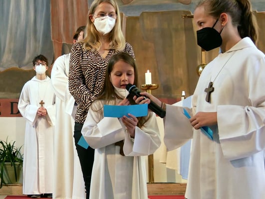 Alle kamen auch sofort zum Altar und zogen sich die Ministrantenrobe über. Jetzt war die Schar der MinistrantInnen komplett. Und jede/r von ihnen wurde dann von Martha Mikulka kurz vorgestellt: