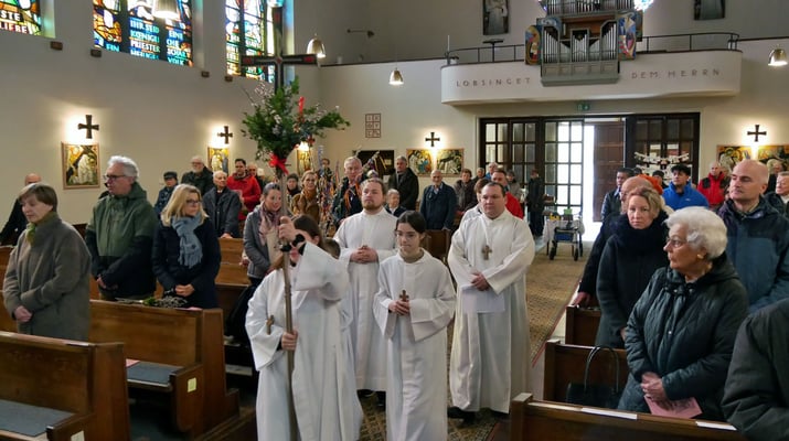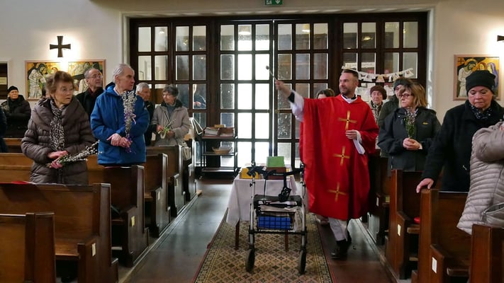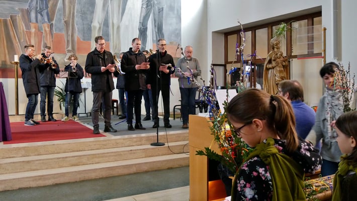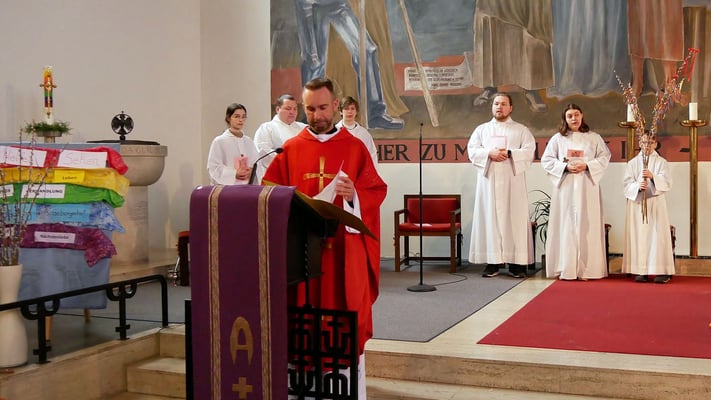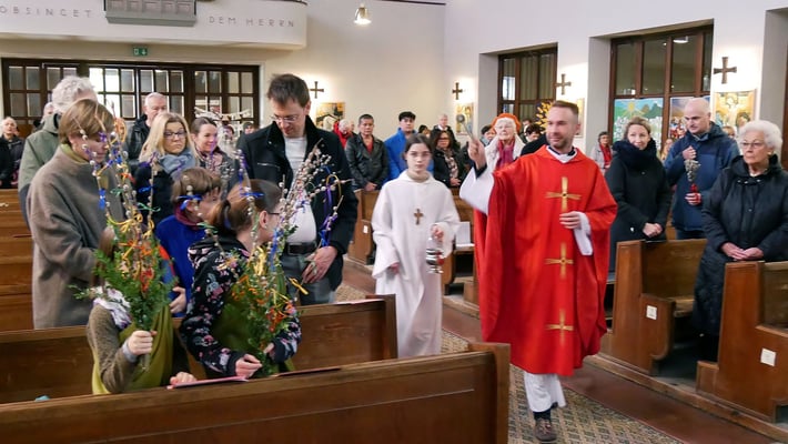 Leider musste wegen leichtem Regenfall die Palmweihe im Kongresspark und die Palmprozession abgesagt werden. Stattdessen war um 9:00 Treffpunkt in der Kirche, wo die mitgebrachten Palmzweige geweiht wurden.