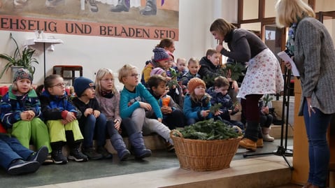 "Lebkuchen oder wenn Mama Kekse backt. Oder die Tannenzweige am Adventkranz." antworten die Kinder. Dazu bekam jedes Kind einen Tannenzweig.
