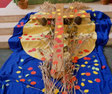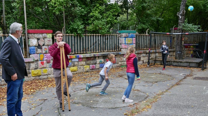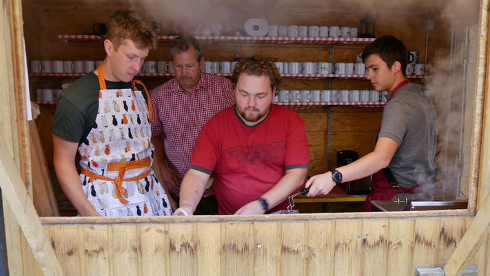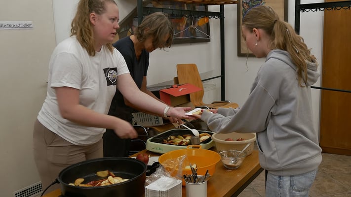 Anschließend Agape im Pfarrsaal mit Schnitzel, Gemüseschnitzel, Kartoffelsalat, Apfelspalten, Bier und Sturm. Vor dem Jungscharheim waren Spielestationen für Kinder gerichtet.