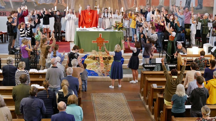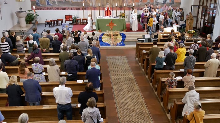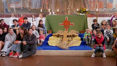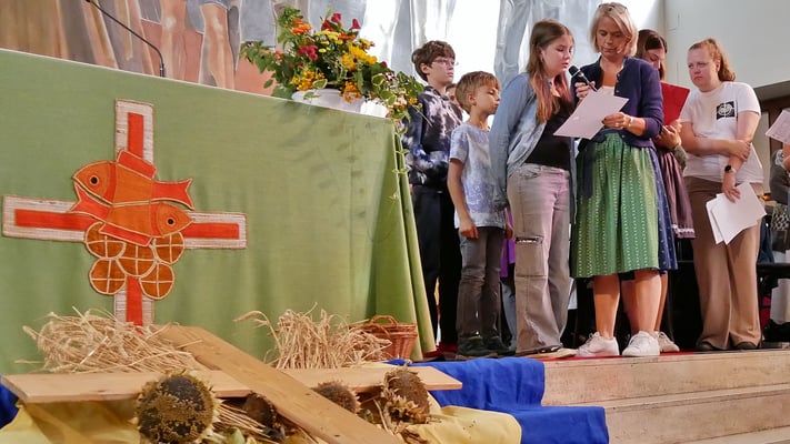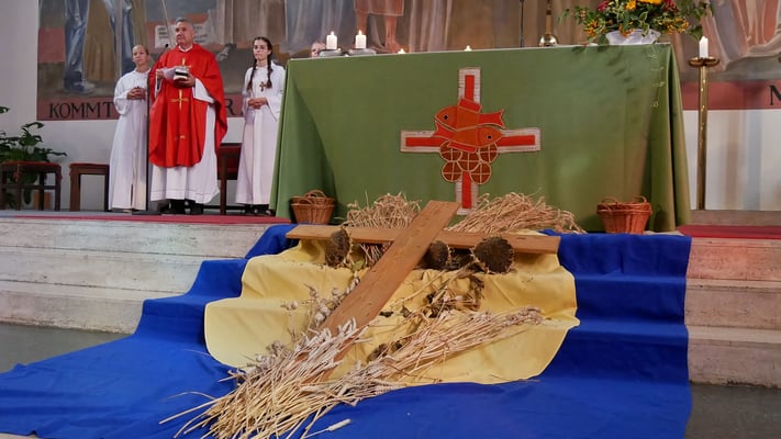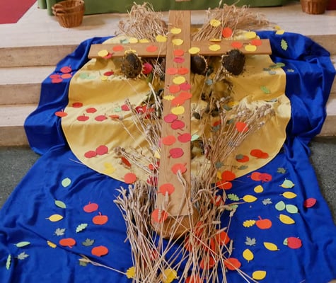 Einer alten Tradition folgend gilt an diesem Sonntag unser Dank dem Herrn für die Gaben der Ernte. Vor dem Altar war, gemäß dem Sonntagsevangelium von der Kreuzerhöhung, ein Kreuz verziert mit Getreideähren und Sonnenblumen als Symbole des Erntedankes.