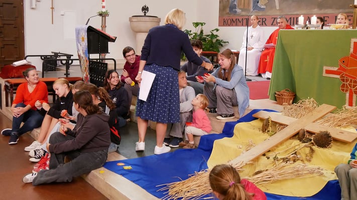 Wegen der unsicheren Wetterlage fand das Erntedankfest im Pfarrsaal statt, die Spielestationen für Kinder am Platz vor dem Jungscharheim.