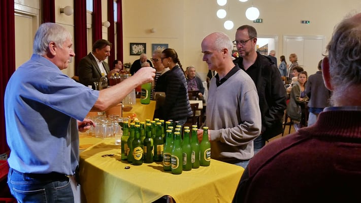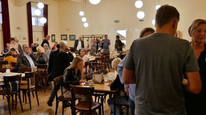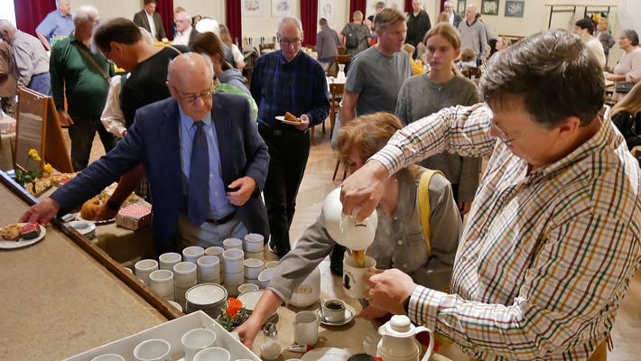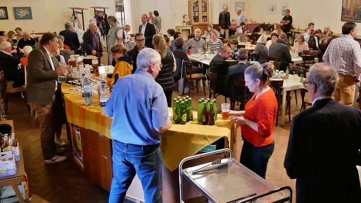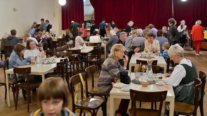 Nach der Messe musste die Agape wegen der unsicheren Wetterlage im Pfarrsaal stattfinden. Für alle Messbesucher waren Tische gerichtet, zum Essen gab es Schnitzel, Gemüseschnitzel, Kartoffelsalat und Apfelspalten und zum Trinken Bier, Sturm und Fruchtsäfte.