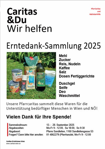 Für das Le⁺O Projekt der Caritas sammeln wir Lebensmittel und Hygieneartikel. Bitte Ihre Spenden von 13. bis 28. September in der Pfarre Sandleiten abgeben. Am Ende werden alle Spenden an die Le⁺O Stelle in Alt-Ottakring übergeben. Danke allen Spendern, die damit Menschen in Not helfen.
