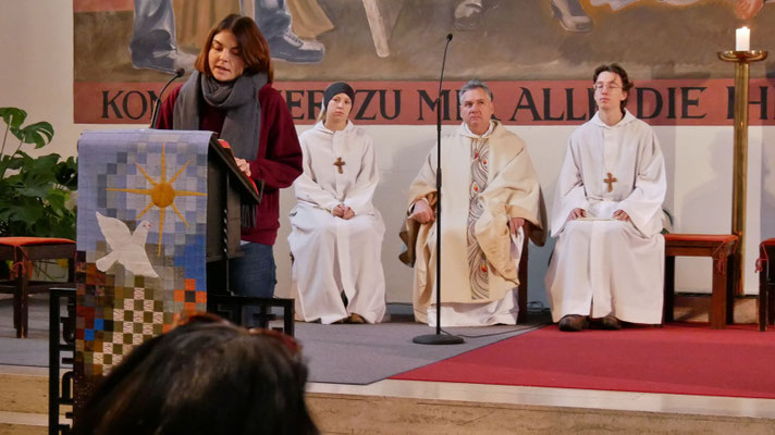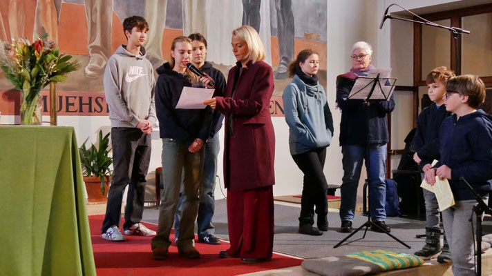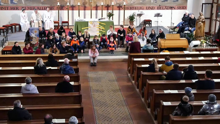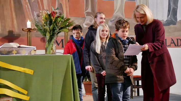 Nach der Lesung kamen alle Jungscharkinder zum Altar und Martha Mikulka fragte die Kinder was sie mit "Dunkel" und "Hell" verbinden.