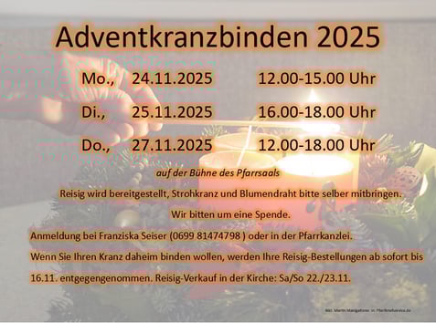 Montag, Dienstag und Donnertsag vor dem ersten Adventsonntag sind alle, die Lust und Zeit haben, zum gemeinsamen Adventkranzbinden eingeladen. Wer den Adventkranz lieber zu Hause binden möchten, kann frisches Reisig in der Pfarrkanzlei bestellen.