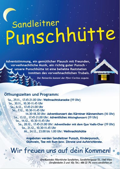 Das Ziel der Punschhütte ist es für die Pfarrgemeinde Sandleiten und deren Freunde eine Plattform für Kommunikation und Gemütlichkeit zu schaffen. Wir wollen an den 4 Adventwochenenden und nach der Mette Freude, Gemütlichkeit und natürlich Punsch verbreiten.