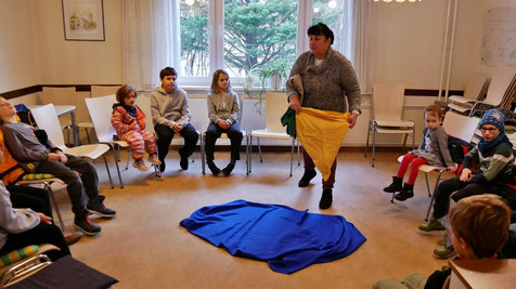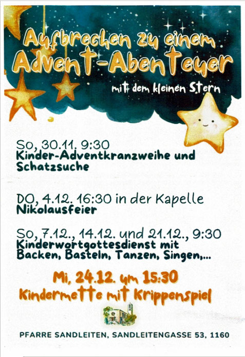 An den vier Adventsonntagen brachen wir gemeinsam mit den Kindern auf zu einem Abenteuer mit dem kleinen Stern. In der Kindermette spielen Kinder die Geschichte vom kleinen Stern, der gemeinsam mit 3 anderen Sternen als großer heller Stern in Bethlehem ankommt.