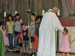 Unsere Kleinen können sich während der Messe mit ihren Eltern in der Seitenkapelle aufhalten. Dort gibt es Bücher, Puzzles, Spielsachen und Buntstifte zum Zeichnen. Über die in der Kapelle angebrachten Lautsprecher kann man die Messe aber dennoch verfolgen und mitbeten.