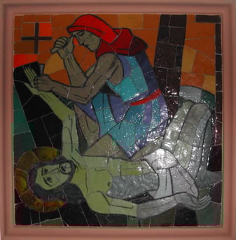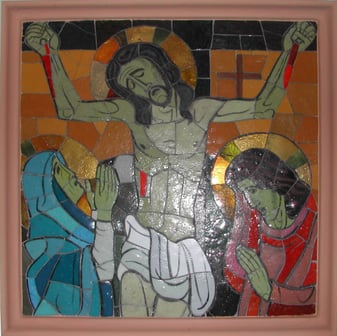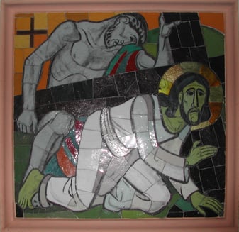 Die vierzehn Mosaikbilder des Kreuzweges stammen, so wie alle Mosaikfenster in der Kirche, von Karl Hauk und wurden 1941 angebracht.